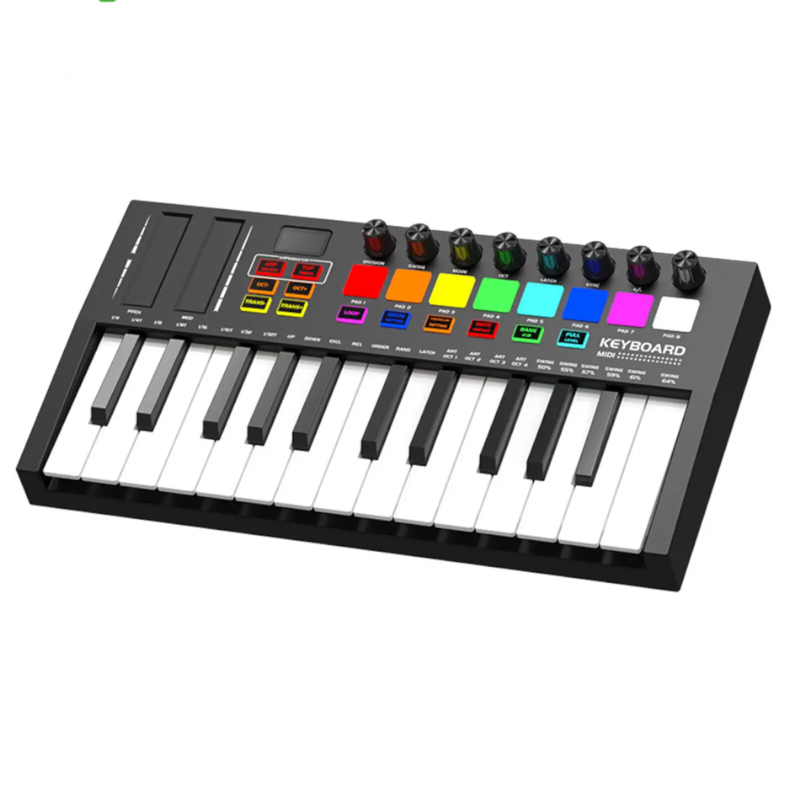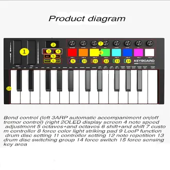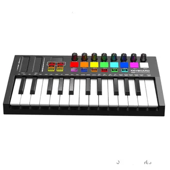 Unlock your musical potential with this 25-key MIDI keyboard! Take control of your sound with the professional controller, while the mini USB keyboard allows for ultimate portability. The 8 RGB percussion pads add a splash of color and creativity to your playing. Start creating and performing like a pro now!