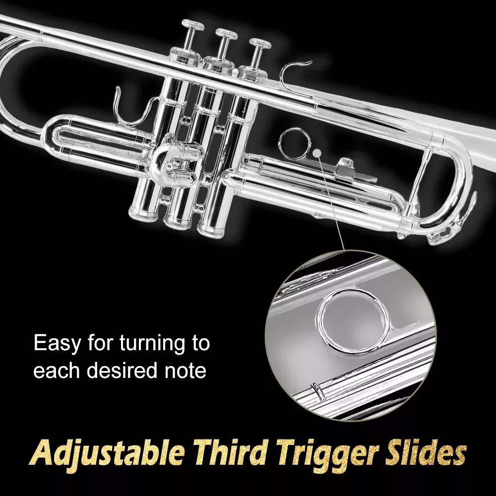 The package includes B flat Trumpet, Cleaning cloth, 7C Mouthpiece, Hard Case with straps, 12-Month Product Warranty backed by our awesome customer support team ready to help.